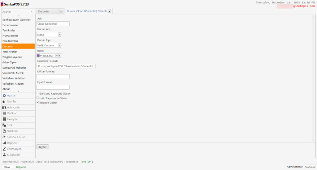 Ana Menü > Yönetim > Ayarlar > Durumlar > Burada, Durum Ekle‘ye tıklayın.