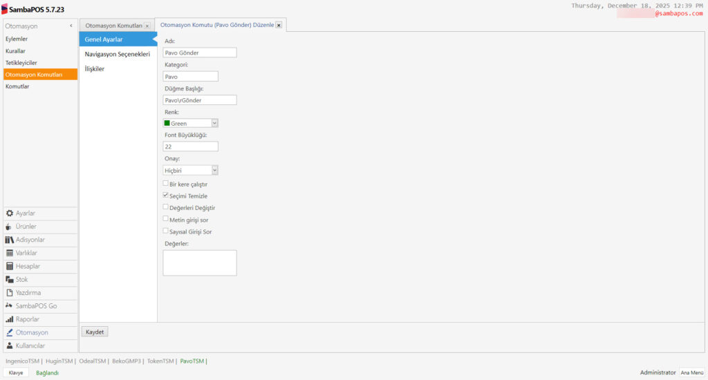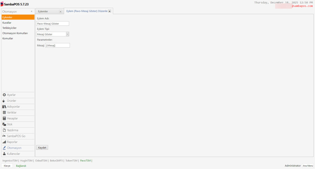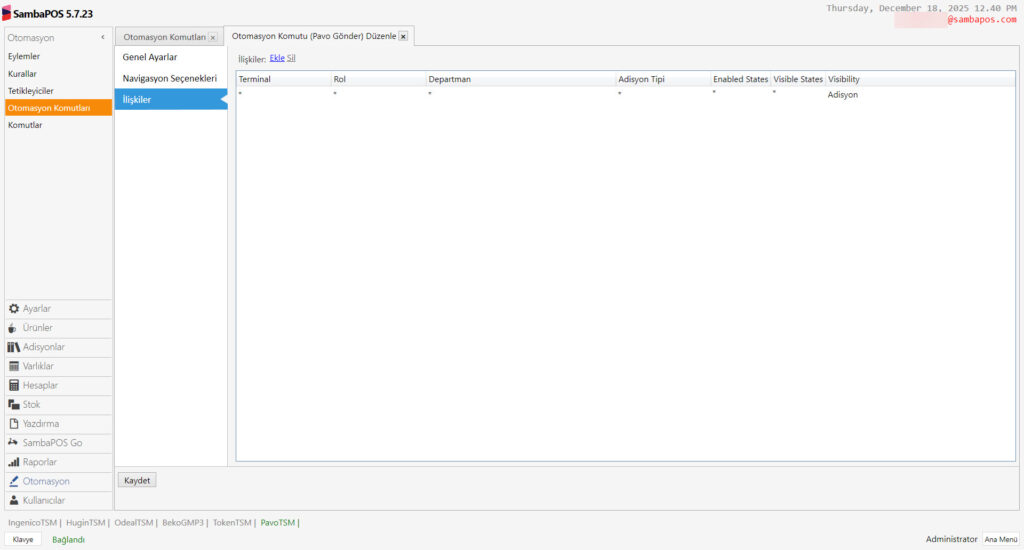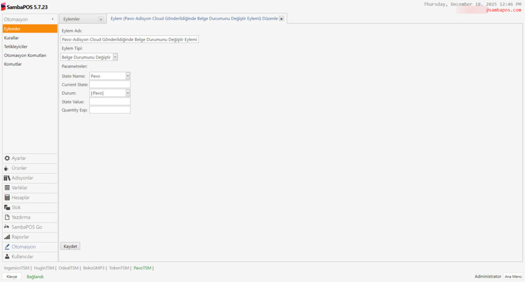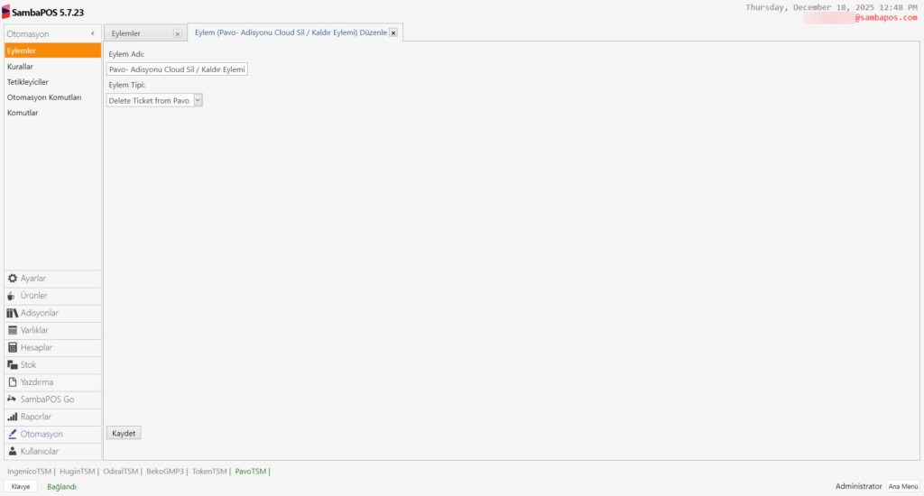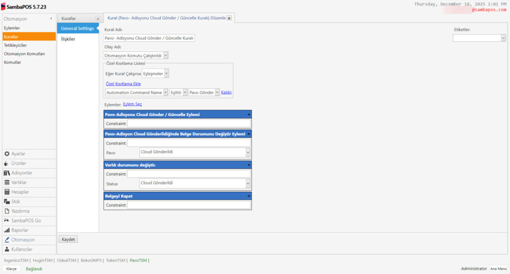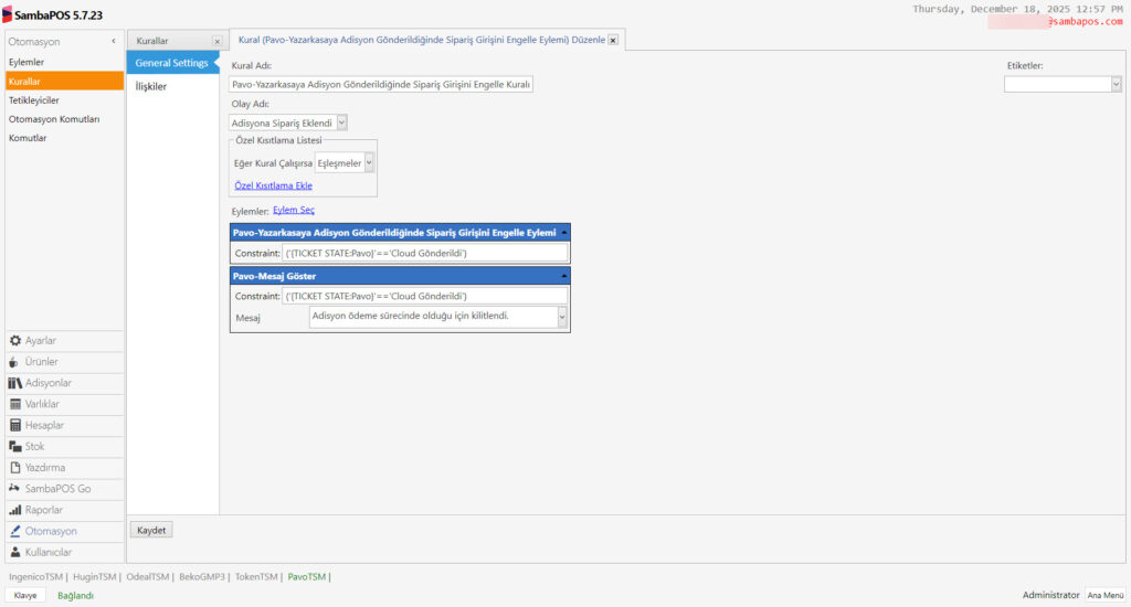 Bu dökümanda SambaPOS’daki adisyonları Pavo Cihazına Göndermek İçin Gerekli Durum – Otomasyon – Komutu – Eylem ve Kuralların nasıl ekleneceği anlatılmaktadır.