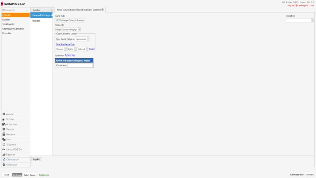 Ana Menü > Yönetim > Otomasyon > Kurallar > Belge Ödendi Kontrolü Kuralı > Burada X30TR Cihazdan Adisyonu Kaldır Eylemini ikinci sıraya ekleyin.