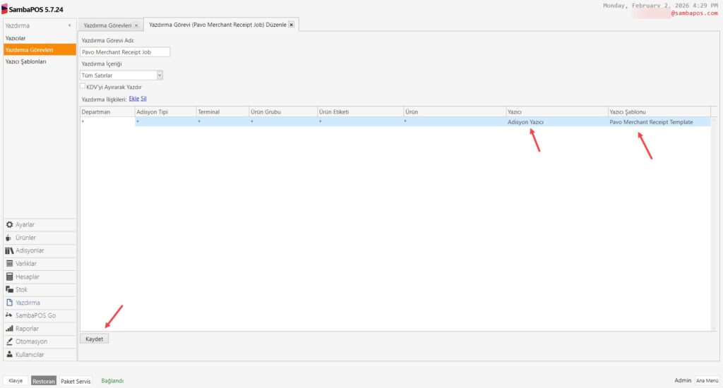 Ana Menü > Yönetim > Yazdırma > Yadırma Görevleri > Pavo Merchant Receipt Job Yazdırma Görevi