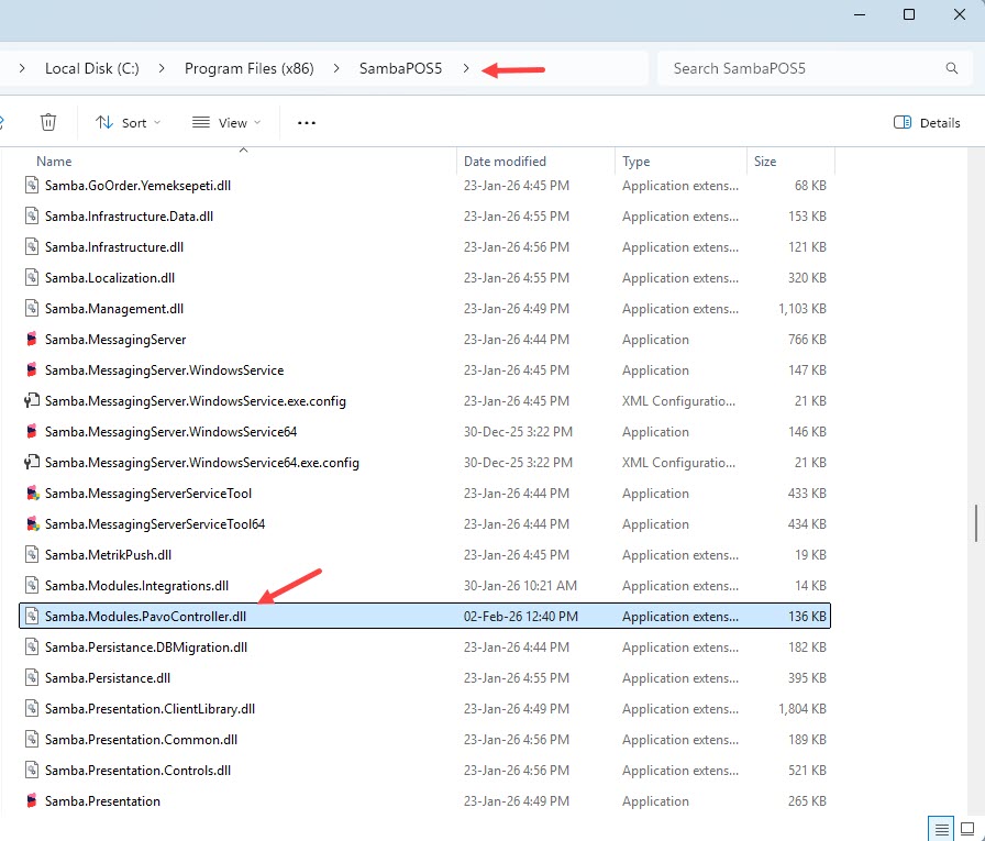 SambaPOS tamamen kapalıyken SambaPOS’un yüklü olduğu ana klasörde bulunan Payment Controller klasöründeki Samba.Modules.PavoController.dll isimli dosyayı SambaPOS’un yüklü olduğu ana klasöre taşımanız gerekmektedir;