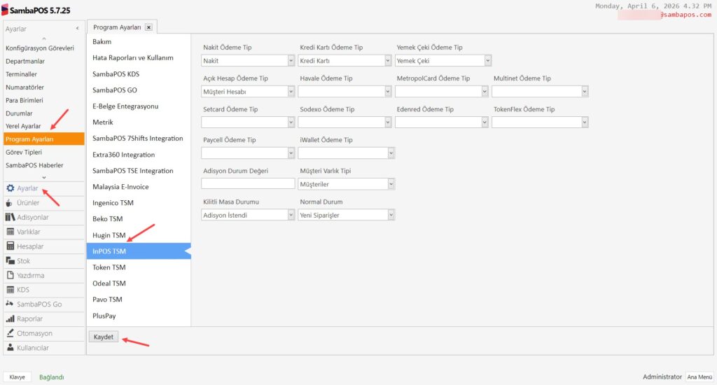 Ana Menü > Yönetim > Ayarlar > Program Ayarları > inpos TSM > Burada, Nakit ve Kredi Kartı ve diğer ödeme tipleriniz için ilgili alanları seçmeniz gerekiyor.