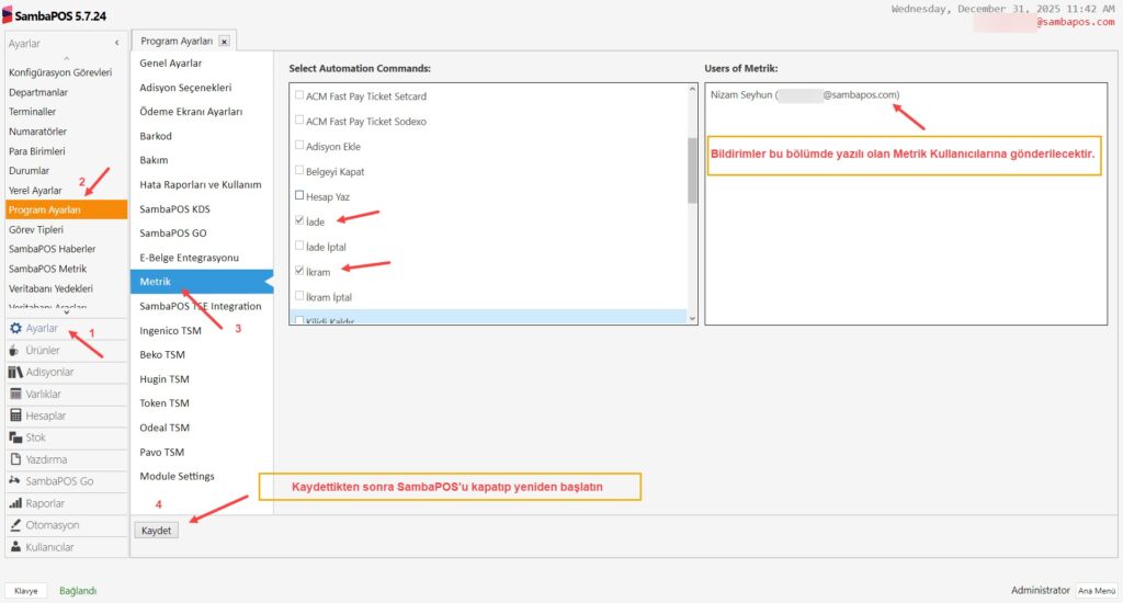 Bu dökümanda SambaPOS 5.7.24 ve üzeri versiyonlarda çalışan Metrik’ten anlık bildirim alma işleminin nasıl alınacağı anlatılmaktadır.