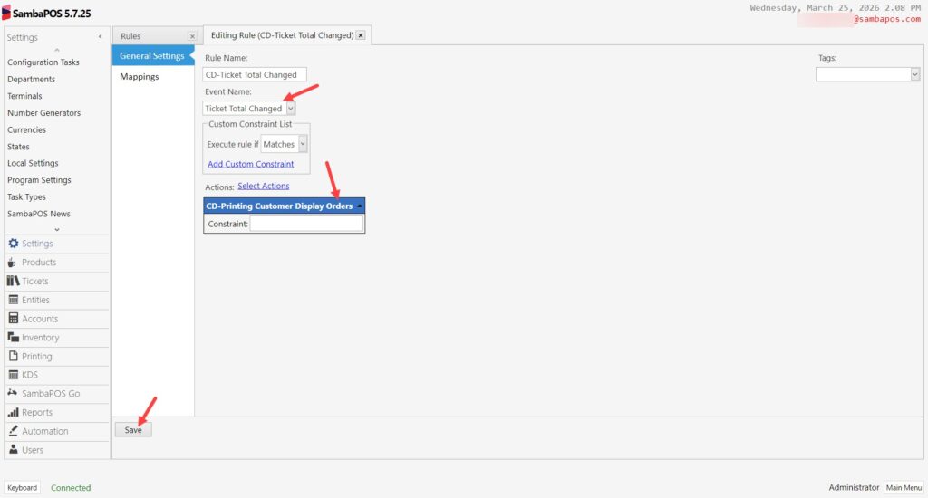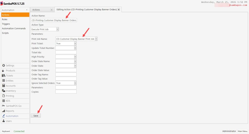 Main Menu > Manage > Automation > Rules > Ticket Payment Check Rule > Here add CD-Printing Customer Display Banner Orders Action into the rule.