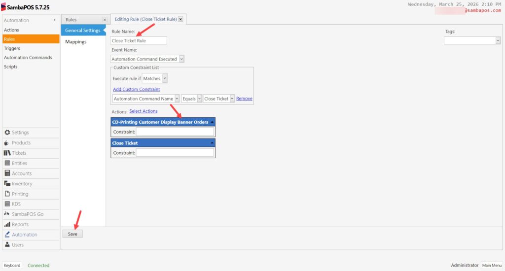 Main Menu > Manage > Automation > Rules > Close Ticket Rule > Here add CD-Printing Customer Display Banner Orders Action into the rule.